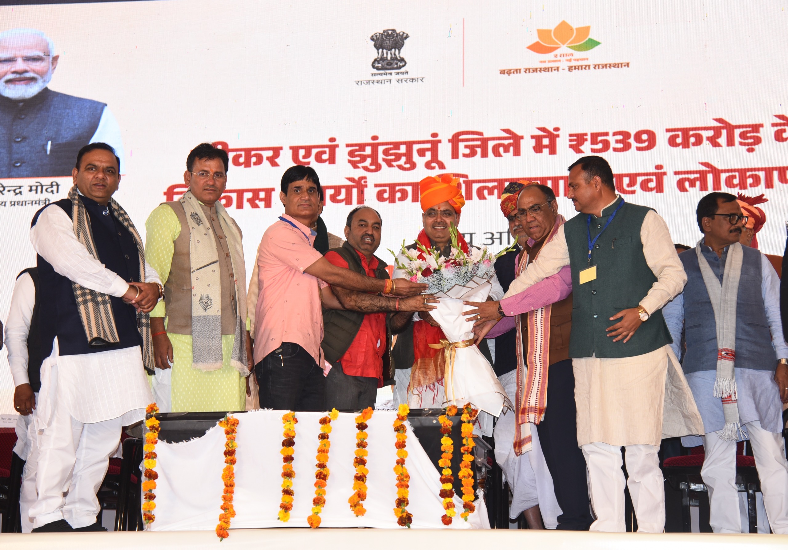सीकर जिले के लिए 155 करोड़ रुपये के और झुंझुनूं जिले के लिए 384 करोड़ रुपये के विकास कार्यों का लोकार्पण और शिलान्यास किया गया, जिनमें भगेगा-नीमकाथाना रेलवे स्टेशन के बीच आरओबी, सबलपुरा स्टैंड से भढ़ाढ़र तिराहे तक फोरलेन सड़क, चिड़ावा उपजिला अस्पताल, नवलगढ़ सौंदर्यीकरण कार्य, आरडीएसएस योजना के विकास कार्य सहित कई परियोजनाएं सम्मिलित हैं। समारोह को बड़ी संख्या में गणमान्य नागरिकों और ग्रामीणों ने उत्साह के साथ सुना।